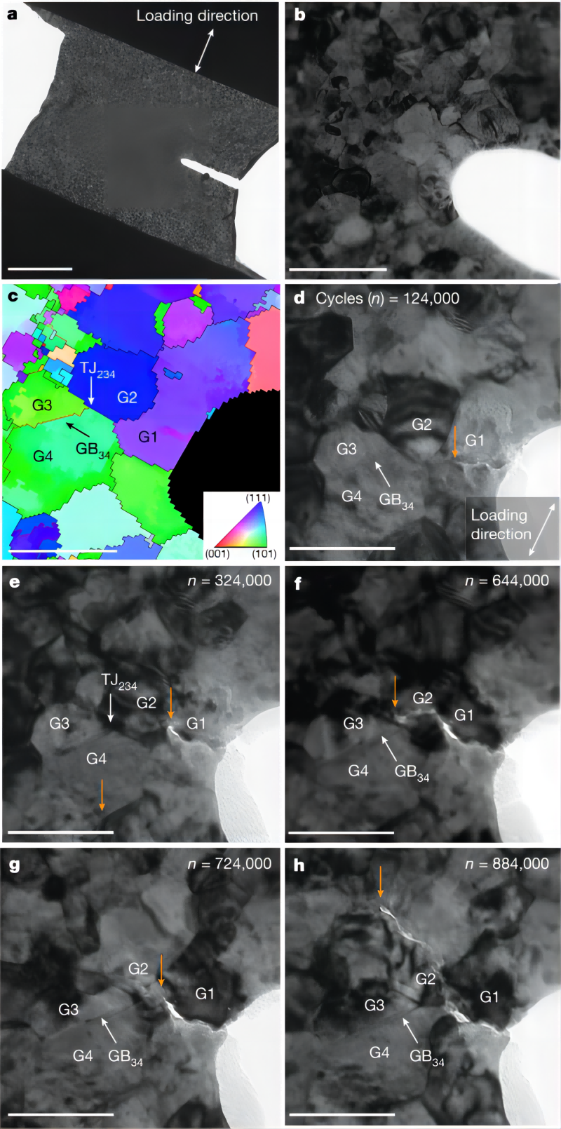 金屬的疲勞涉及在重復(fù)機(jī)械載荷下通過裂紋的增量擴(kuò)展而逐漸失效。在結(jié)構(gòu)應(yīng)用中,疲勞占使用中故障的90%。疲勞的預(yù)防依賴于大的安全系數(shù)和低效的過度設(shè)計(jì)的實(shí)施。在傳統(tǒng)的抗疲勞冶金設(shè)計(jì)中,開發(fā)微結(jié)構(gòu)以阻止或減緩裂紋的發(fā)展。裂紋擴(kuò)展被認(rèn)為是不可逆的。相比之下,在其他材料類別中,基于潛在愈合機(jī)制和損傷逆轉(zhuǎn)的替代方案。本篇報(bào)道是純金屬在產(chǎn)生疲勞裂紋,可以進(jìn)行內(nèi)在的自我修復(fù)。直接觀察到納米級(jí)疲勞裂紋的早期進(jìn)展,正如預(yù)期的那樣,裂紋前進(jìn),偏轉(zhuǎn)和捕捉在錨定的微觀結(jié)構(gòu)障礙。在這里,美國(guó)桑迪亞國(guó)家實(shí)驗(yàn)室和美國(guó)德克薩斯A&M大學(xué)材料科學(xué)與工程系的Michael J. Demkowicz與 Brad L. Boyce團(tuán)隊(duì),探討了裂紋通過可被描述為由局部應(yīng)力狀態(tài)和晶界迀移的組合引起的裂紋側(cè)面冷焊的過程愈合。疲勞裂紋可以通過與微觀結(jié)構(gòu)特征的局部相互作用在金屬中自主愈合,前提是工程師如何設(shè)計(jì)和評(píng)估結(jié)構(gòu)材料疲勞壽命的最基本理論。并且還討論在各種服務(wù)環(huán)境中的疲勞的影響。該項(xiàng)工作以標(biāo)題為:“Autonomous healing of fatigue cracks via cold welding”,發(fā)表在Nature上。