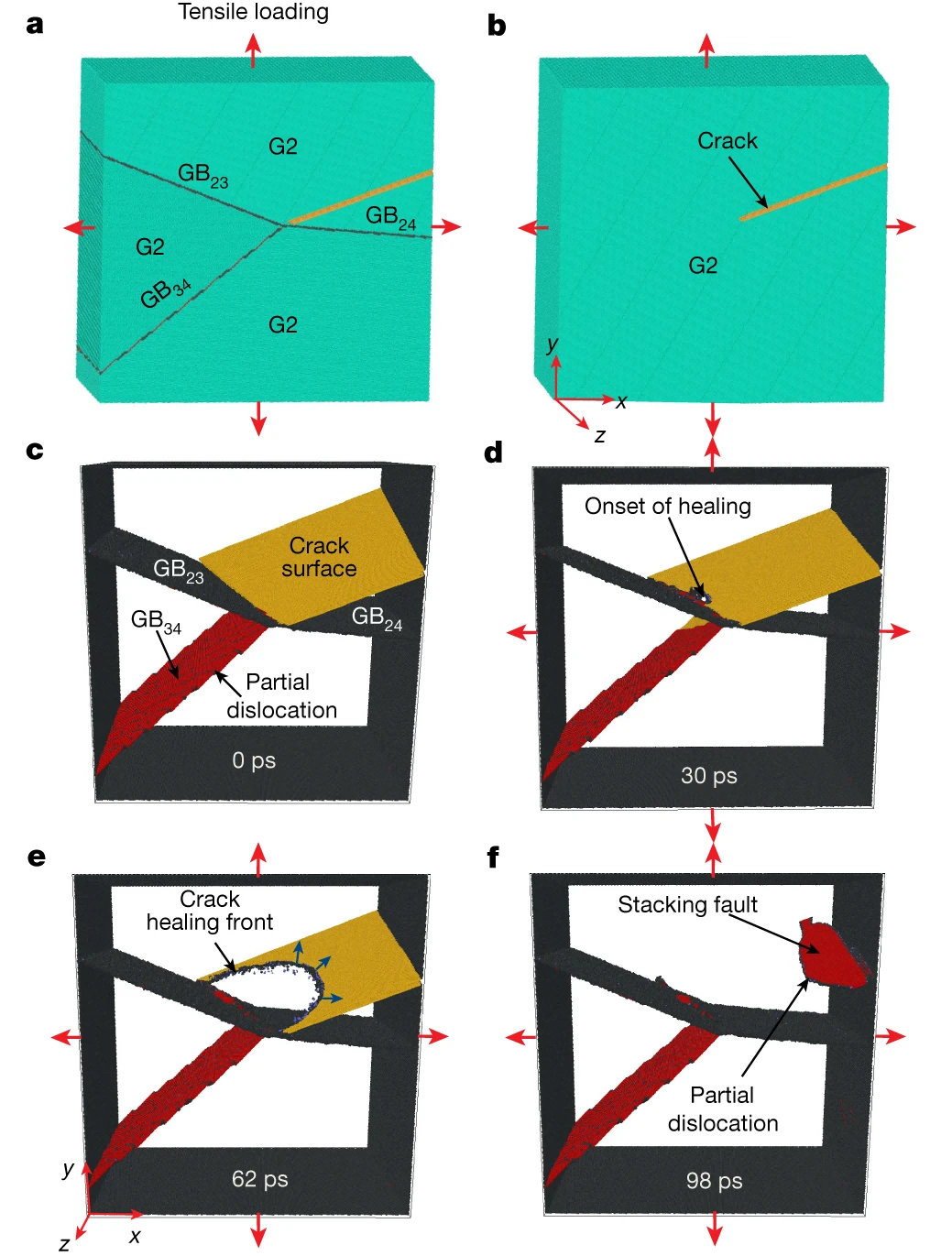 圖3. 一個(gè)原子模型證實(shí)邊界遷移,裂紋側(cè)面接觸和愈合。©2023 Nature