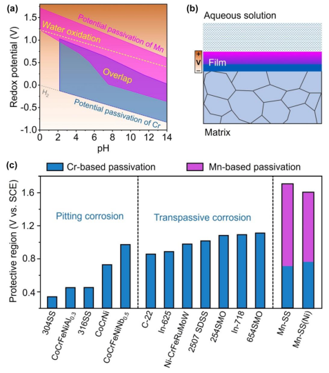 圖4 .序貫雙鈍化和根本性增強(qiáng)。( a ) Cr和Mn的潛在鈍化區(qū),兩者存在潛在重疊。Eh - pH圖由HSC Chemistry數(shù)據(jù)庫計(jì)算得到,在T = 25℃,1 bar條件下,溶液物種的活性為1 mol / L。( b )順序雙鈍化策略示意圖,突出了鈍化順序和基體化學(xué)均勻性的結(jié)合。( c ) Mn-SS,Mn-SS ( Ni )和其它Cr鈍化合金的鈍化區(qū)。所選合金為304 SS 、Co Cr Fe Ni Al0.3 、316 SS、CoCrNi 、FeCoNiCrNb0.5 、2507超級(jí)雙相不銹鋼( SDSS ) 、赫斯特合金C - 22 NBS ( C-22 ) 、Inconel 625 NBS ( In-625 ) 、Ni38Cr21Fe20Ru13Mo6W2 ( Ni-CrFeRuMoW )、Inconel 718 NBS ( In-718 ) 、254SMO和654SMO SSS ( 654SMO ),具體條件分別為藍(lán)色:Cr -占優(yōu)勢,紫色:Mn -占優(yōu)勢。