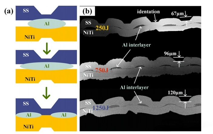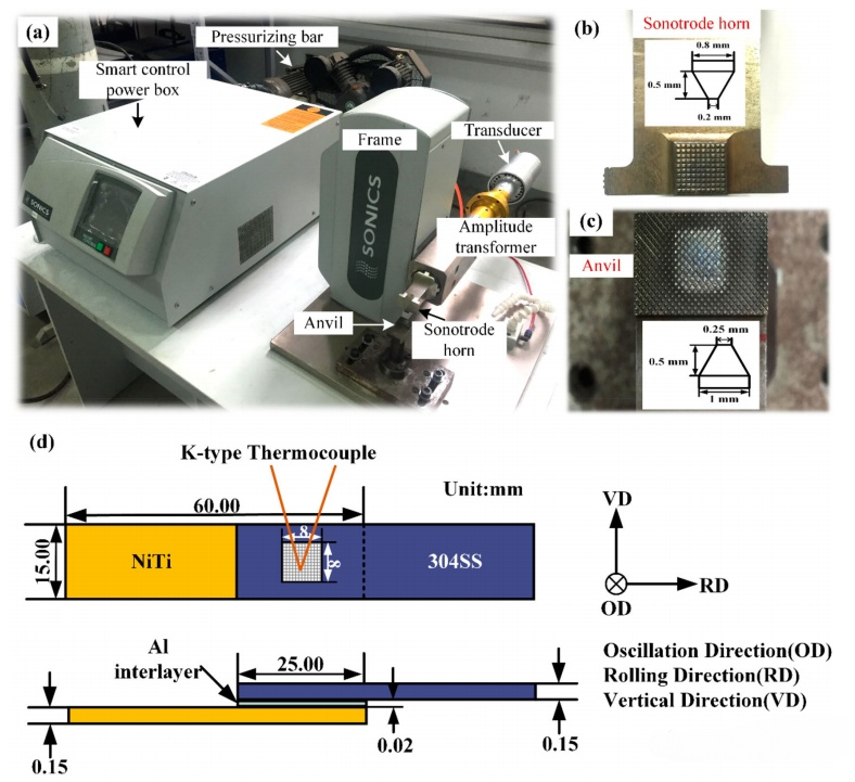 超聲波點(diǎn)焊(USW)是一種新型焊接技術(shù),在過去20年中被應(yīng)用于航空、醫(yī)療、微電子和汽車制造等行業(yè)。已有研究人員利用超聲焊接NiTi合金,然而,目前的研究主要集中在超聲波焊接工藝參數(shù)對軟質(zhì)和輕質(zhì)金屬接頭性能和組織的影響,以及用熱輔助超聲焊接的新工藝對夾層(箔、粉末和復(fù)合夾層)進(jìn)行強(qiáng)化,并且缺乏對硬質(zhì)合金超聲焊接方面的研究。純鋁具有低熔點(diǎn)和高線性膨脹系數(shù),這使其能夠快速達(dá)到半熔化狀態(tài),并填充材料之間的間隙,以增強(qiáng)面間冶金結(jié)合。在超聲固相連接過程中,發(fā)現(xiàn)鋁和NiTi的組合不太可能產(chǎn)生脆性相,而在中等焊接能量的條件下,鋁和SS不會產(chǎn)生金屬間化合物層。本文探索了一種可靠的NiTi/SS連接方法,提供了使用USW將不同類型的NiTi和SS連接到鋁夾層的詳細(xì)分析。