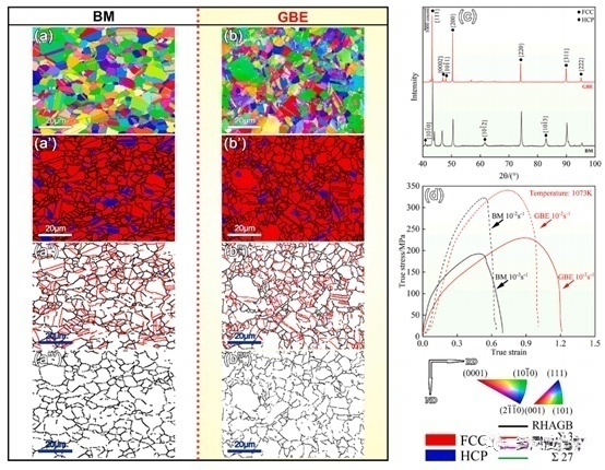 高熵合金(High-entropy alloys, HEAs)又稱多主元素合金(multi-principal element alloys, MPEA),因其具有無限的元素組合可能性、優(yōu)異的性能和廣闊的研究潛力而受到廣泛關(guān)注。然而,金屬材料的強(qiáng)度與延性通常是相互排斥的,強(qiáng)度與延性之間的權(quán)衡一直是研究的主要方向。通過調(diào)整熱機(jī)械加工(TMP),可以調(diào)整合金的組織,使其具有間隙固溶強(qiáng)化、晶粒細(xì)化強(qiáng)化、析出相強(qiáng)化、相變強(qiáng)化等。晶界特性和錯(cuò)取向角對(duì)晶界滑動(dòng)(GBS)行為有顯著影響,與低Σ重合位置點(diǎn)陣(CSL)晶界相比,隨機(jī)大角度晶界(RHAGBs)更容易吸收位錯(cuò)并驅(qū)動(dòng)晶界滑移。前人在研究HEA的高溫變形和斷裂時(shí),很少考慮晶界結(jié)構(gòu)轉(zhuǎn)變的影響。來自中國Northeastern University的Z.Y. You等人研究了晶界工程(GBE)對(duì)亞穩(wěn)態(tài)Fe50Mn30Co10Cr10高熵合金(HEA)高溫性能的影響。對(duì)Fe50Mn30Co10Cr10進(jìn)行了熱機(jī)械加工(TMP),其中然后在1173 K下熱處理10min的試樣作為基材(BM)。將BM樣品以10%的壓下率冷軋,然后在1023 K下在Ar氣氛中退火10min,然后水冷作為GBE樣品。圖1給出了BM和GBE樣品在1073K下的反極圖(IPF)圖、相圖、晶界特征分布(GBCD)和真應(yīng)力-應(yīng)變曲線。如圖所示,大部分ε-馬氏體位于遠(yuǎn)離孿晶界的位置,而少量ε-馬氏體則在孿晶界形成。BM樣品中低?的CSL晶界所占比例約為48.0%。而GBE中低?晶界主要集中在細(xì)晶內(nèi),約占66.4%,TMP提高了GBE樣品中奧氏體相的穩(wěn)定性。圖1d顯示了BM和GBE樣品在不同應(yīng)變率下的流動(dòng)應(yīng)力曲線,發(fā)現(xiàn)與傳統(tǒng)的BM樣品加工方法相比,經(jīng)過GBE優(yōu)化后的HEA具有顯著的高溫力學(xué)性能。