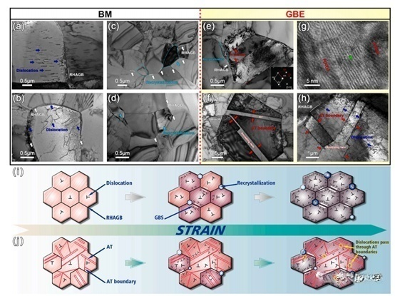 圖2樣品在1073 K、10-3 s -1應(yīng)變速率下拉伸斷裂后斷裂表面附近區(qū)域的TEM顯微圖:(a–d) BM,(e, f, h) GBE,(g) 沿[011]γ軸的HRTEM 圖像顯示了SF;變形期間微觀結(jié)構(gòu)演變的示意圖:(i)RHAGB,(j)AT邊界。