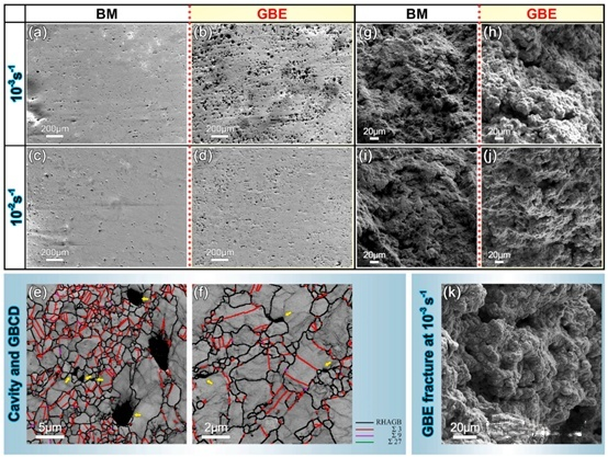 圖3 SEM顯微圖拉伸斷裂后的表面孔隙的分布:(a, c)BM,(b, d) GBE,在1073 K下應(yīng)變率:(a, b) 10-2 s -1,(c, d)10-3 s -1。(e, f) EBSD中BC +晶界的顯微結(jié)構(gòu)圖說明了空腔與晶界特征之間的關(guān)系。 (g h, i, j, K) BM和GBE試樣拉伸斷口的SEM形貌。