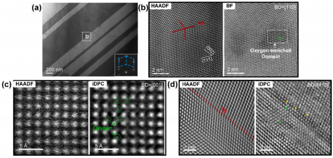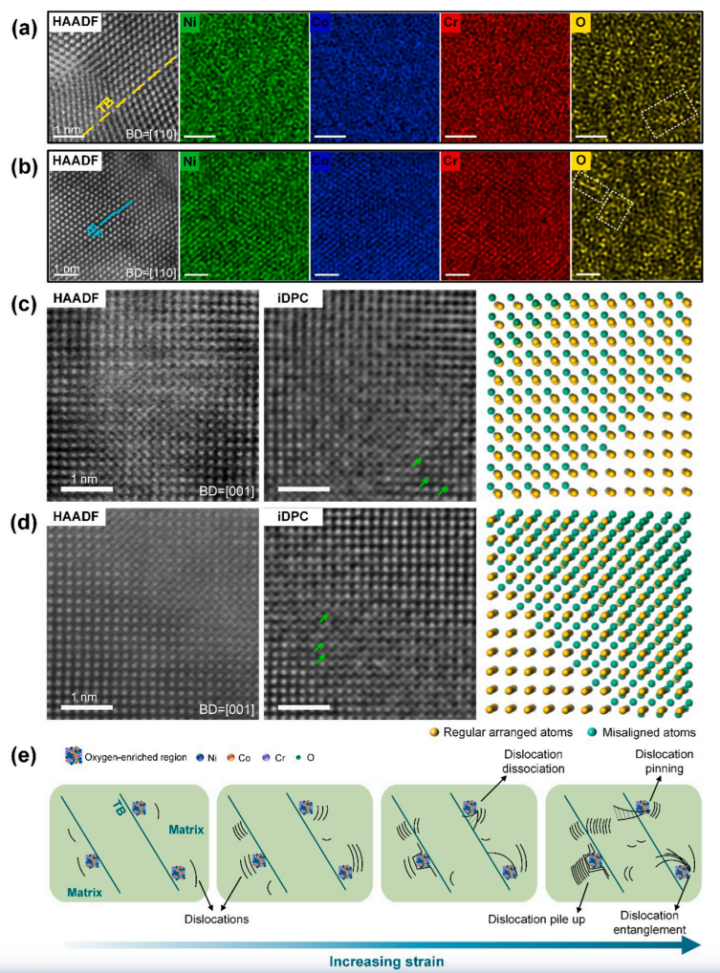 針對(duì)此浙江大學(xué)電鏡中心余倩教授等人利用原位單傾拉伸樣品桿結(jié)合iDPC-STEM成像和EDS表征對(duì)含有6 at% (原子百分比)氧原子的NiCoCrO中熵合金(MEA)進(jìn)行了位錯(cuò)-孿晶界相互作用的影響研究。中熵合金中晶格畸變的擴(kuò)散使其具有較大的氧間隙固溶度。氧原子占據(jù)了四面體和八面體的間隙位,并傾向于在孿晶界和層錯(cuò)等缺陷處富集。在塑性變形過程中,孿晶界附近的富氧區(qū)阻礙了位錯(cuò)直接傳遞或交叉滑移到另一個(gè)孿晶面,造成了明顯的位錯(cuò)糾纏、位錯(cuò)部分解離和滑移方向的偏離。該研究成果揭示了與孿晶界和間隙原子協(xié)同效應(yīng)相關(guān)的強(qiáng)化機(jī)制。