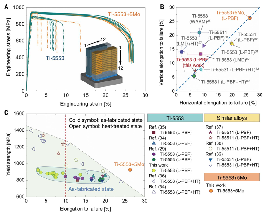 鑒于此,近日,第一作者Jingqi Zhang和Michael J. Bermingham澳大利亞昆士蘭大學(xué)Matthew S. Dargusch教授為通訊作者聯(lián)合在Science頂刊發(fā)題為“Ultrauniform, strong, and ductile 3D-printed titanium alloy through bifunctional alloy design.”的最新發(fā)現(xiàn)。研究人員展開了針對微觀結(jié)構(gòu)的設(shè)計策略。他們認識到添加特定的納米粒子可能有助于調(diào)控凝固過程中的晶粒生長和相變行為,從而改善金屬合金的微觀結(jié)構(gòu)。因此,針對激光粉末床熔融技術(shù)中存在的粗柱狀晶粒和異質(zhì)相等問題,研究人員開始探索添加納米粒子的方法。通過在金屬合金中添加鉬(Mo)納米粒子,研究人員希望實現(xiàn)晶粒細化和相變控制,從而提高金屬零件的機械性能。他們通過對模型合金 Ti-5Al-5Mo-5V-3Cr 的研究發(fā)現(xiàn),添加鉬納米粒子確實能夠促進晶粒的細化,并抑制不需要的相的形成,從而使得合金具有更加均勻的微觀結(jié)構(gòu)和優(yōu)異的機械性能。