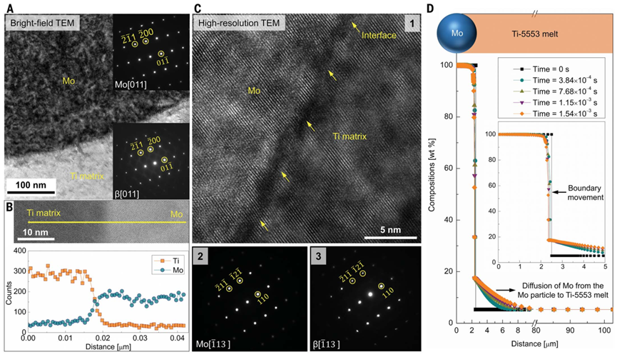圖4展示了探究富鉬顆粒與鈦基體之間的界面特性,利用SEM-EDX和透射電子顯微鏡(TEM)-EDX線掃描進行了表征。SEM-EDX分析顯示,從鉬顆粒到鈦基體之間存在著濃度的漸變,而TEM-EDX線掃描也證實了這一現(xiàn)象。此外,高分辨率的TEM成像揭示了富鉬顆粒與鈦基體之間具有連貫的界面。SEM和TEM的觀察結(jié)果表明,橫跨鉬粒子和鈦基體的過渡區(qū)域在晶粒細化過程中起著重要作用。然而,由于這些表征是在經(jīng)歷了凝固和固態(tài)轉(zhuǎn)變的樣品上進行的,目前還不清楚界面上的過渡區(qū)是在熔池中形成的,還是凝固后固態(tài)擴散的結(jié)果。盡管如此,本研究使用了DICTRA(擴散控制轉(zhuǎn)變)進行了擴散模擬,以幫助理解凝固過程中Mo粒子的溶解行為。雖然目前的實驗技術(shù)無法完全解釋界面的形成過程,但這些結(jié)果為深入理解Mo粒子在凝固過程中的行為提供了有價值的線索。